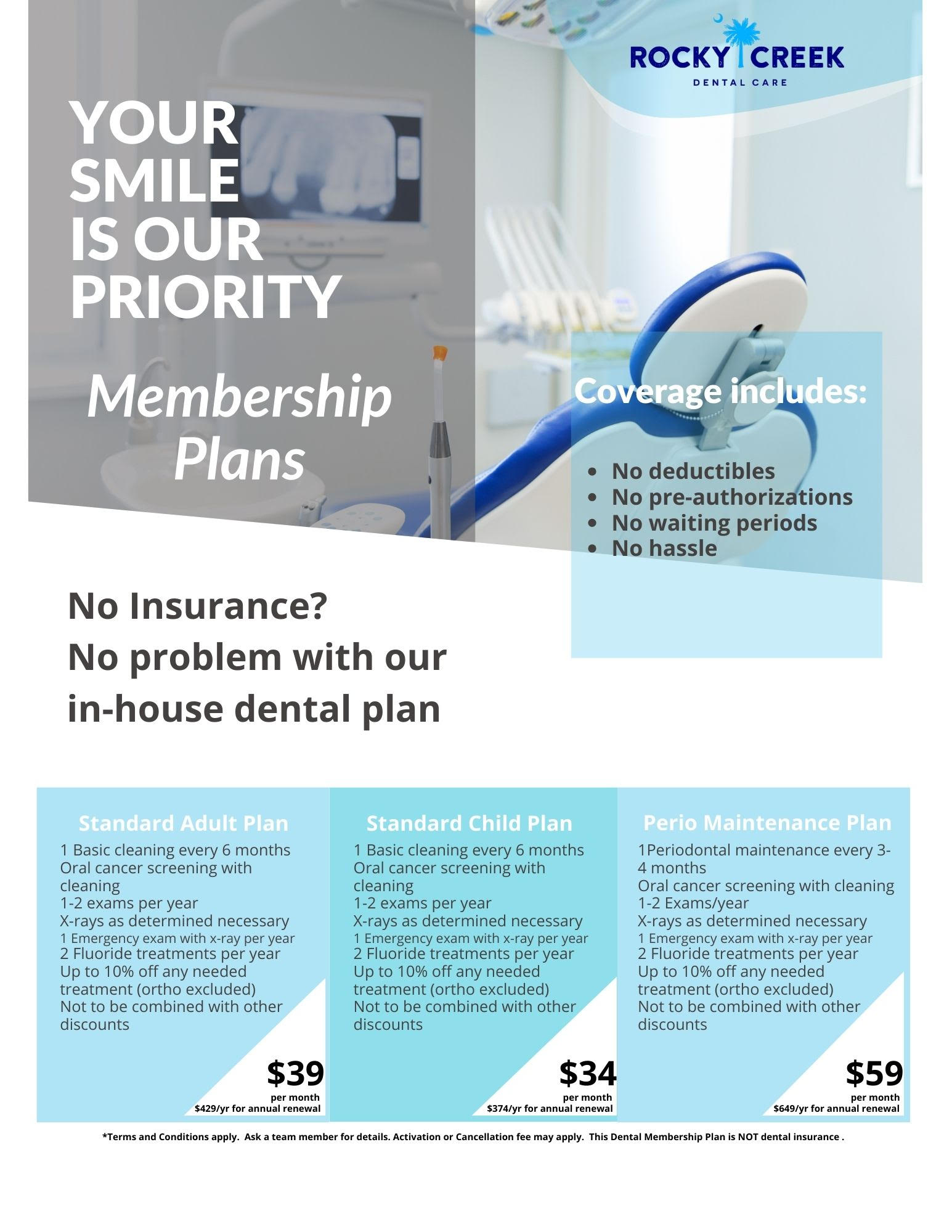 We know dental insurance can be difficult to obtain, and paying out of pocket isn’t exactly…fun. That’s why we’re introducing the Rocky Creek Dental Membership Plan. Our Membership Plan is designed to provide our patients without dental benefits with the care they deserve.
